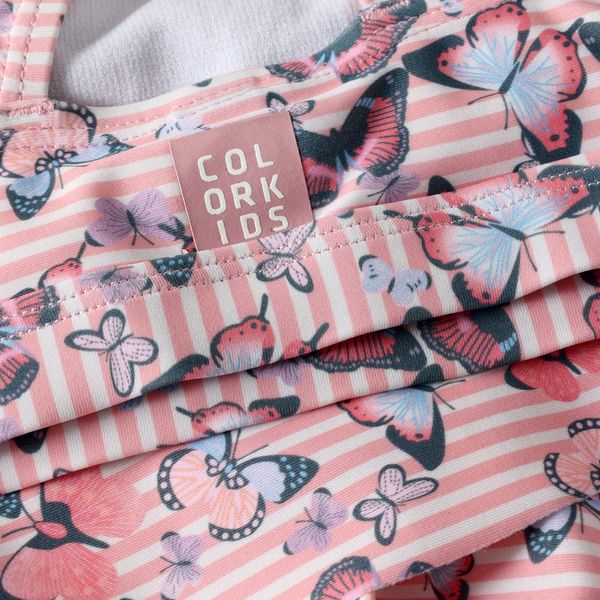 "Discover the colorful bikini set from Color Kids, specially designed for girls. This set impresses with its vibrant all-over print and unique design, in which the bikini bottoms are decorated with a charming skirt. The stretchy nature of the material ensures excellent freedom of movement and comfort, making it the ideal choice for all activities in the water and on the beach."