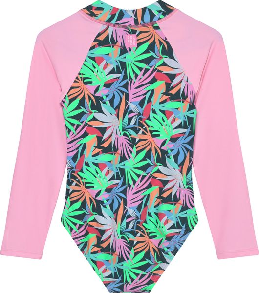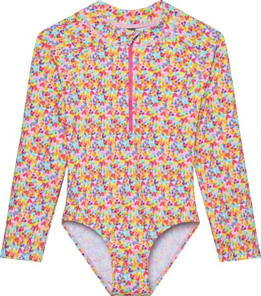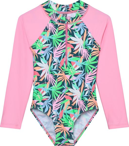 "The long-sleeved swimsuit from Color Kids is the ideal choice for girls who love swimming and water sports. With its eye-catching all-over print, it attracts everyone's attention and combines style with functionality. Thanks to the practical front zip, the swimsuit is easy to put on and take off, while the small fabric protector on the collar provides additional comfort."