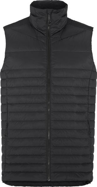"Lightweight, water-repellent down vest with recycled ripstop fabric, ideal for active men."