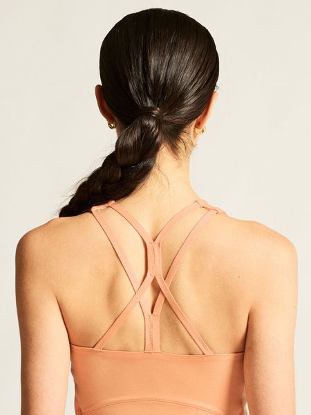 "Soft, stretchy women's singlet with crossed straps, ideal for sports and everyday wear, made from recycled material."