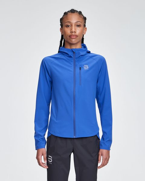 Lightweight, breathable women's running jacket with hood, reflective details and sustainable materials for cool days.