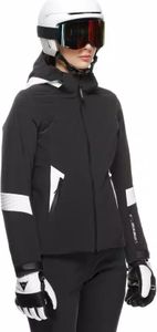 "The elastic inner lining at the back provides additional comfort, making this jacket the perfect choice for female skiers who want to push their limits without sacrificing comfort. Practical details such as waterproof zippers, multiple pockets for ski passes and other items as well as an adjustable drawstring at the hem and an adjustable hood round off the design of this technical jacket."