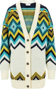 Oversized wool cardigan made from 100% merino wool with a classic pattern and recycled buttons for sustainable style.