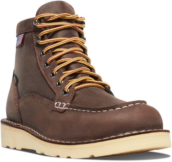 "The Men's Bull Run Moc Toe 6" GTX from Danner is a versatile boot designed for both work and everyday wear. Made in the USA with imported components, this boot combines traditional craftsmanship with modern technologies. The full-grain, tanned leather provides exceptional durability and water resistance, while the waterproof GORE-TEX lining ensures your feet stay dry by allowing sweat and moisture to escapeu00e4."