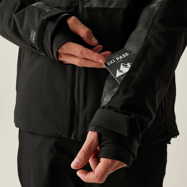 "Practical features such as a detachable, helmet-compatible hood, adjustable cuffs and hem as well as underarm fasteners with mesh inserts for additional ventilation make this jacket a must-have for winter sports enthusiasts. Fully welded seams and water-repellent zippers provide additional protection from the elements, while a range of pockets, including a ski pass pocket and an inside pocket with goggle cleaning cloth, ensure functionality."