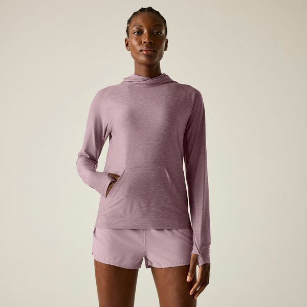 "Lightweight women's hoodie with quick-drying fabric, UV protection, fixed hood and kangaroo pocket for versatile activities."