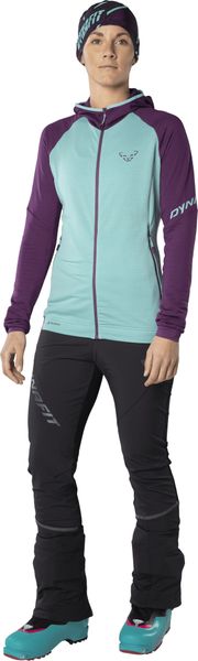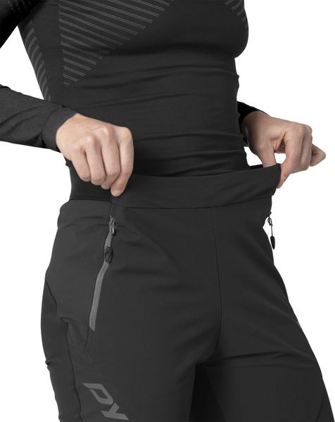 "Clever material mix for fast ski tours: The versatile Speed Dynastretch trousers for womenu00u00u00f impress with their slim cut and well thought-out functionalityu00u00e4t in the backcountry and on the slopes. If you want to get the best out of yourself on the mountain, freedom of movement and maximum breathability are essential. At the same time, of course, you also need protection from wind and weather, as conditions at high altitudes can quickly become unpleasant. The Speed Dynastretch trousers rely on a functional hybrid construction to provide you with the best possible support and are a first-class choice for all winter activities. On the front, the designers use wind- and water-repellent, stretchy softshell, while the back is made from brushed, breathable stretch material. The inside of the trousers is brushed for pleasant warmth and comfort, so you can easily do without a base layer on warmer days. The pre-shaped knees and adjustable elasticated waistband guarantee a perfect fit and optimum freedom of movement. The hem with integrated snow guard can be extended so that you can wear the trousers with touring ski boots as well as normal mountain boots. The model is rounded off with reflectors so that you are more visible in the dusk or on night ski tours. Speed Dynastretch trousers u2013 Slim, fast, highly functionalu2013."
