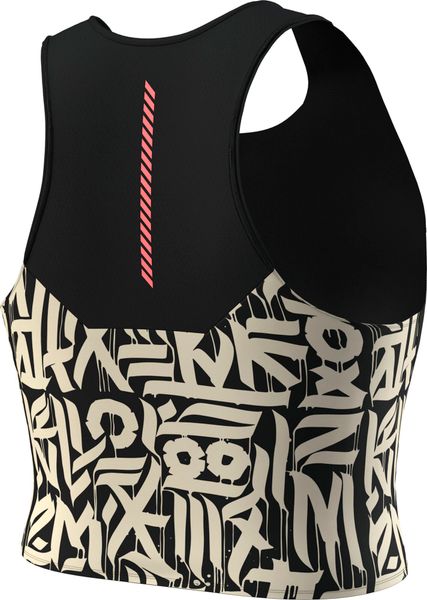 "Technical crop top with integrated bra and mesh inserts, ideal for hot running days and intensive activities."