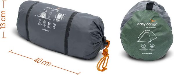 "The Rondane 2 tent from Easy Camp is the ideal choice for outdoorenthusiasts who go on bikeor trekking tours. This unisex tent is specially designed for adventures by bike and impresses with its light weight and compact pack size of just 40 x 13 cm. It offers space for two people and can be set up in just four minutes, while it is ready for use in three minutes. The dome tent is equipped with a WeatherGuard 3000 flysheet, which is made of PU-coated, fire-retardant polyester and has a wateru00e4ule of 3000 mm. The breathable polyester interior ensures a pleasant climate, while the floor remains dry even in wet conditions with a waterproofness of 5000 mm."
