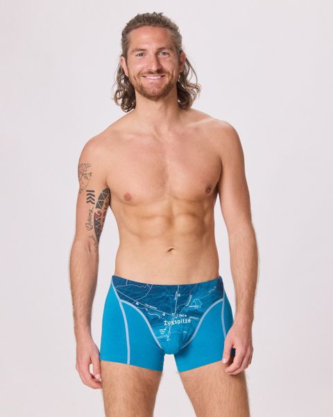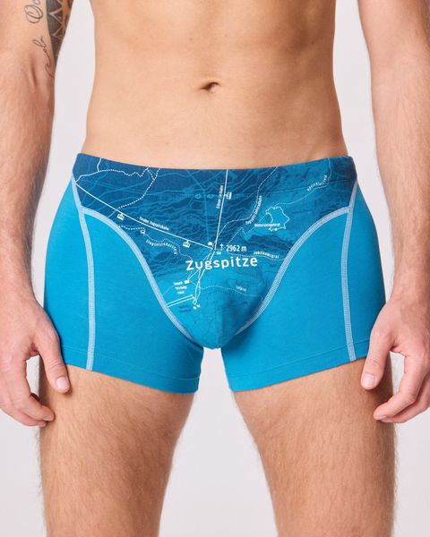 "The Zugspitze boxer shorts in the elegant color peacock blue from "A Beautiful Spot of Earth" are the ideal companion for active days". Thanks to their sporty cut and flat seams, these boxer shorts offer maximum comfort and full freedom of movement. Made from GOTS-certified organiccotton from controlled organic cultivation, they combine sustainability with style. Designed in Austria and produced fairly in the EU, the boxer shorts not only guarantee a comfortable fit, but also a clear conscience."