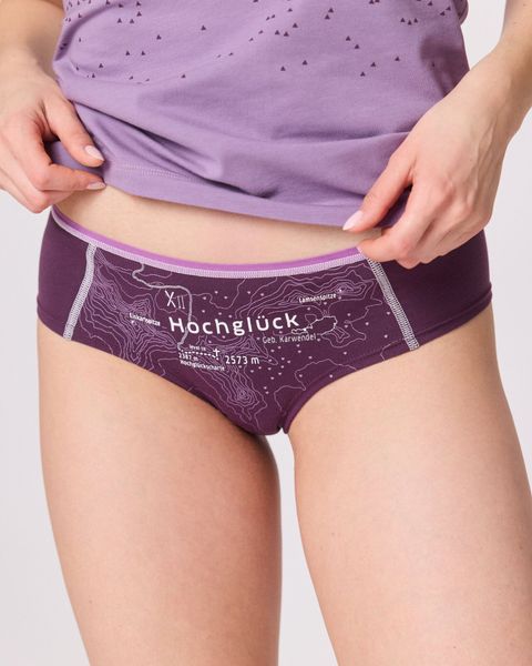 "Discover the high-gloss lilac dark hipster, a pair of women's underpants that not only impresses with its name, but also with its features. These underpants, designed in Austria and fairly produced in the EU, are extremely comfortable to wear thanks to their flat seams and extremely soft elastic waistband. They are the ideal choice for leisure activities and everyday wear and will accompany you on all your adventures in style and comfort"