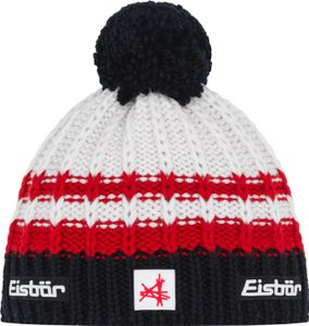 "The Kova Pompom Hat SA by Eisbu00e4r is the ideal companion for anyone who enjoys skiing or other outdoor winter activities. With its chunky knit design in bold block stripes and a fluffy wool pompom, this hat attracts everyone's attention and adds a sporty touch to any winter outfit. It is particularly popular with ski sports fans, not least thanks to the Ski Austria Acon logo, which underlines their connection to winter sports"