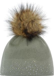 "Elegant hat with sparkling crystal motif and fluffy pompom for stylish warmth on cold days."