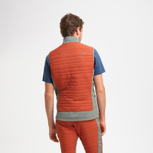 "Technical mid-layer vest with stretch fleece and insulated sections, ideal for skiers and water-repellent."
