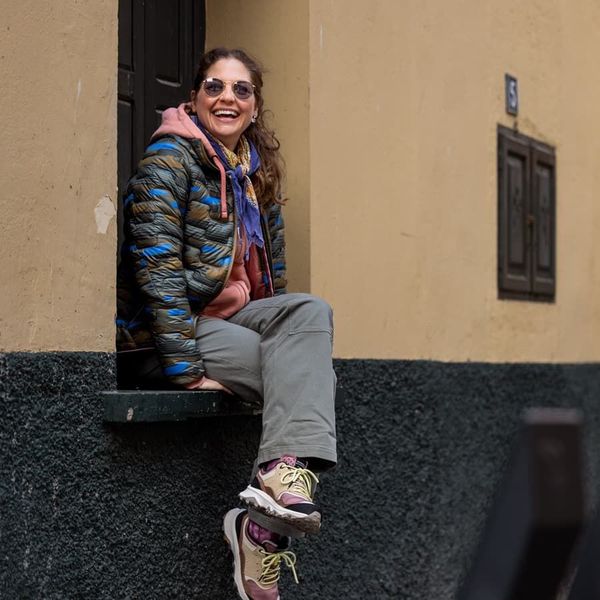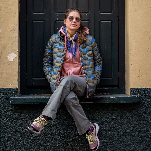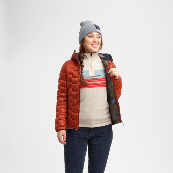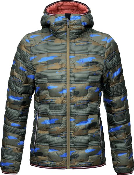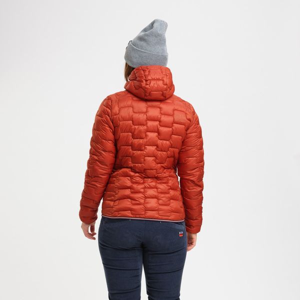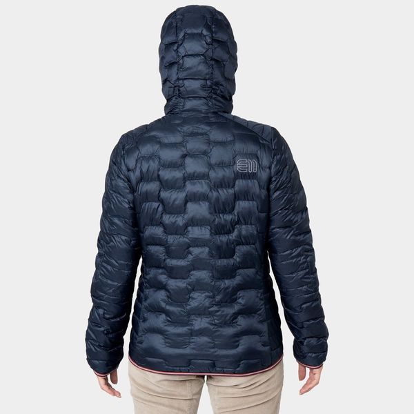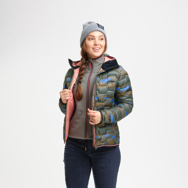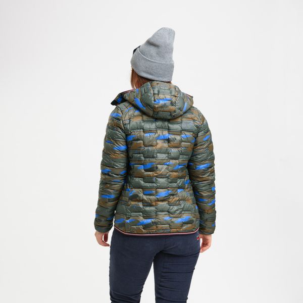"Lightweight hooded jacket with synthetic down, ideal for female skiers in cold, damp conditions."