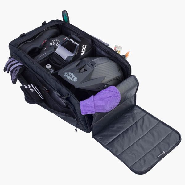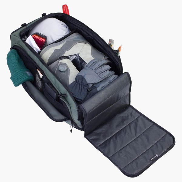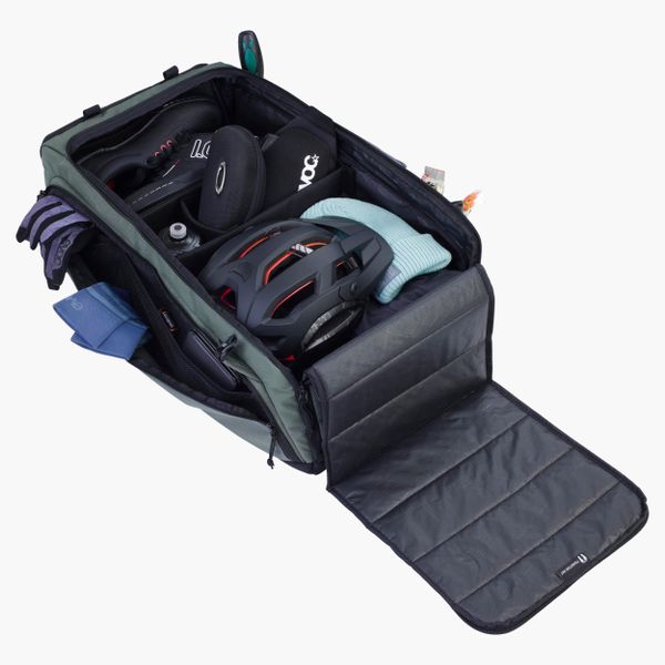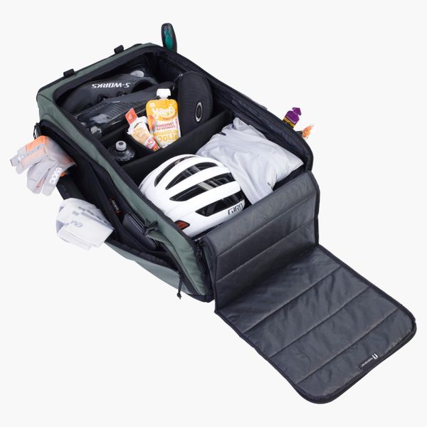 "The Gear Bag 55 from EVOC is the ideal companion for all your adventures, whether cycling or traveling. With a generous volume of 55 liters, this waterproof backpack offers enough space for all your equipment. Thanks to the detachable shoulder straps, the Gear Bag 55 can be worn as a backpack or used comfortably as a handbag. The well thought-out interior layout with variably divisible main compartment allows you to safely stow your equipment such as boots or helmet and ensures quick access thanks to separate zippersu00e4cheru00e4."