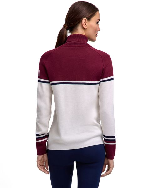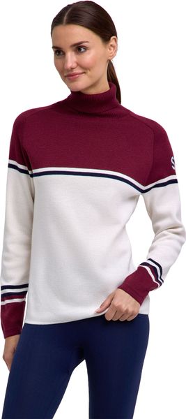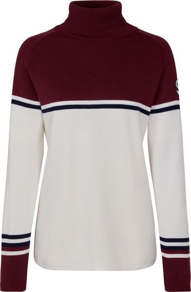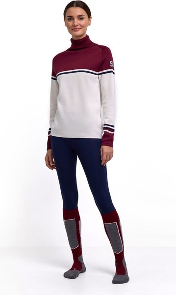 "Thermoregulating women's pullover made from merino wool, ideal for ski touring and freeskiing with a retro design and odor-inhibiting properties."