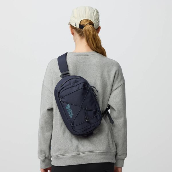 "The Skule Sling 6 from Fju00e4llru00e4ven is the ideal companion for everyday use and particularly suitable for cyclists. With a capacity of 6 liters, this versatile shoulder bag offers enough space for all your essentials. The main compartment has a zipper closure and features a padded laptop compartment to keep your electronic devices safe. The bag is made of robust Oxford 600D recycled polyester and has a 1500mm PU coating, which makes it not only sustainable but also hard-wearing"
