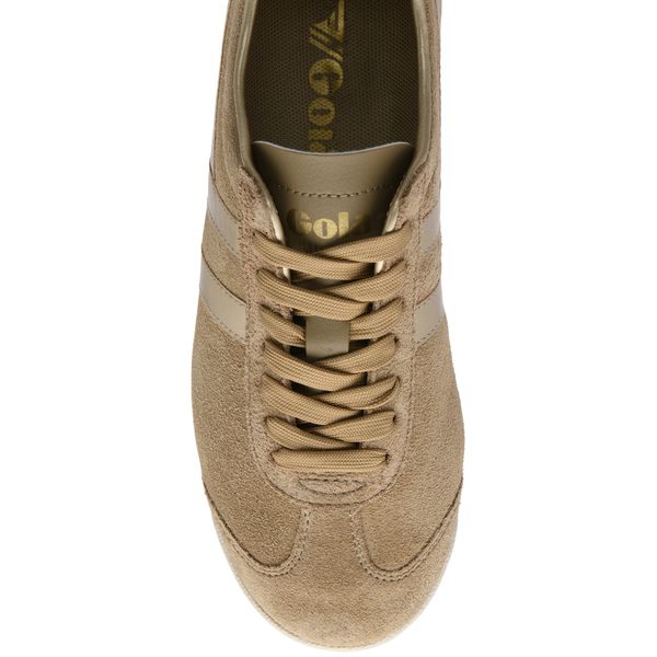"The Bullet Pearl sneaker for women by Gola is the perfect combination of classic design and modern update. With its caramel-colored upper material made of high-quality suede and the striking, pearl-colored heel tab, this shoe attracts everyone's attention. The contrasting details such as the Wingflash and the iconic Gola branding on the side and tongue give the sneaker an unmistakable look"