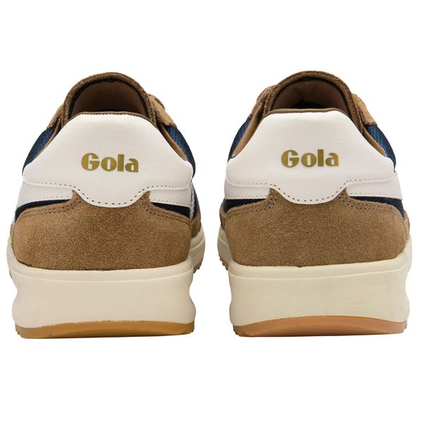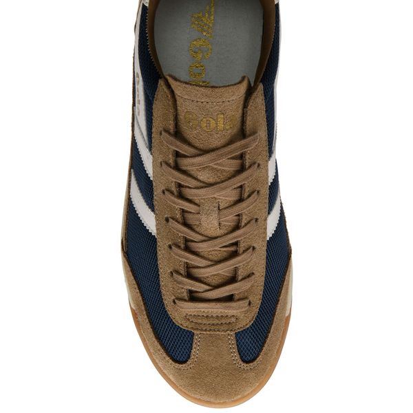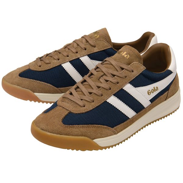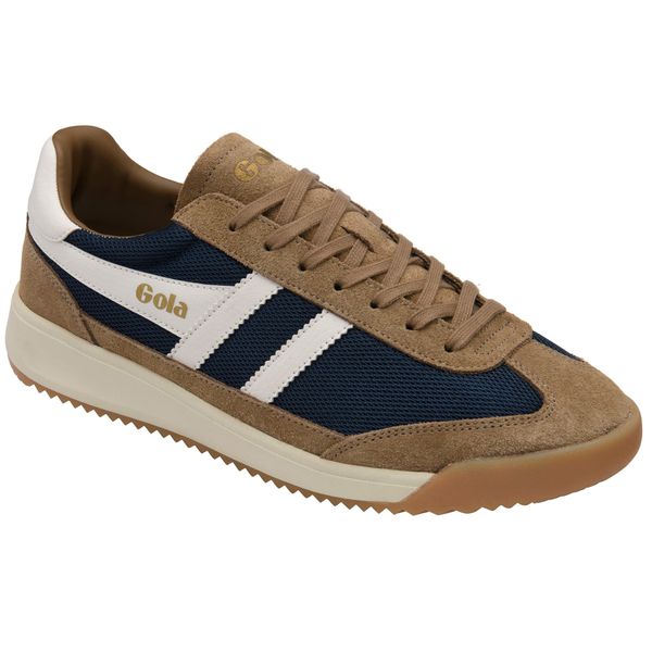"The Tornado '88 mesh sneakers from Gola are a stylish addition to any men's wardrobe and embody the iconic Terracedesign. These trainers combine an off-white mesh with an upper made of high-quality tobaccosuede, which is not only visually appealing but also ensures durability. The navy-colored toothed wingflash trim gives the shoe a sporty and modern look, while the two-tone sole provides a striking contrast."