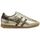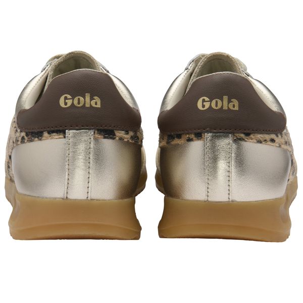 "The Torpedo Glimmer Safari sneaker by Gola for women is the perfect choice for fashion-conscious women who value comfort and style in everyday urban life. Inspired by a model from 1985, this sneaker boasts a striking design with a leopard-printed cowhide leather wingflash with hair layer. The gold-coloured metallic upper gives the shoe a luxurious touch, while the short suede toe cap and brown heel cap underline the retro charm. This combination of classic and modern elements makes the sneaker a real eye-catcher"