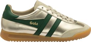 "Experience the Torpedo Glimmer sneaker for women by Gola, a masterpiece that combines the charm of the 80s with modern design. Inspired by Gola's heritage from 1985, this low-profile women's sneaker offers a perfect blend of retro style and contemporary elegance. The metallic gold upper gives the shoe a glamorous touch, while the striking Gola Wingflash branding and heel tab create a distinctive look that is guaranteed to turn heads."