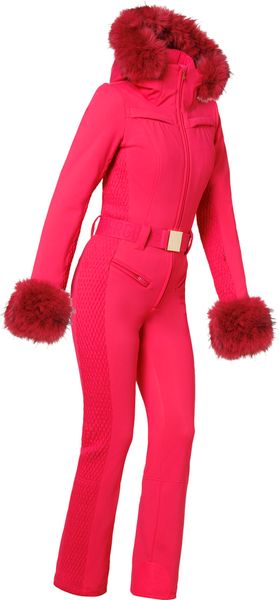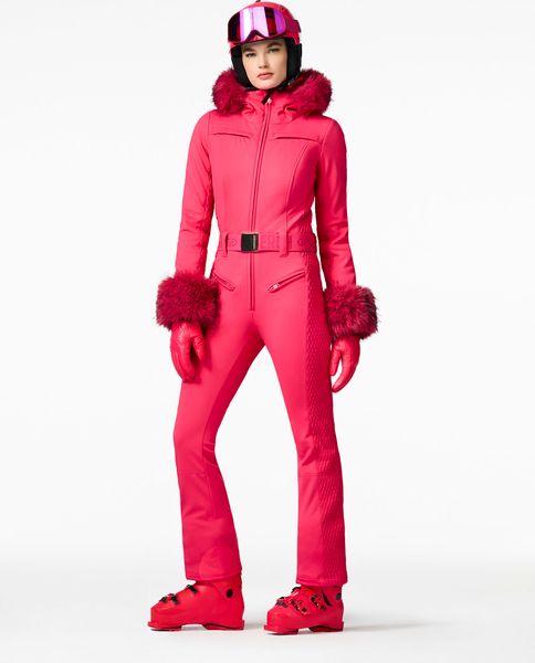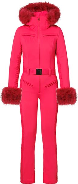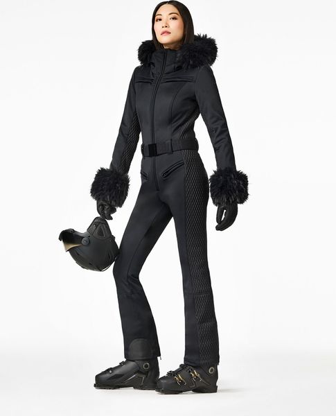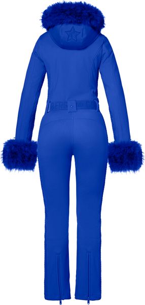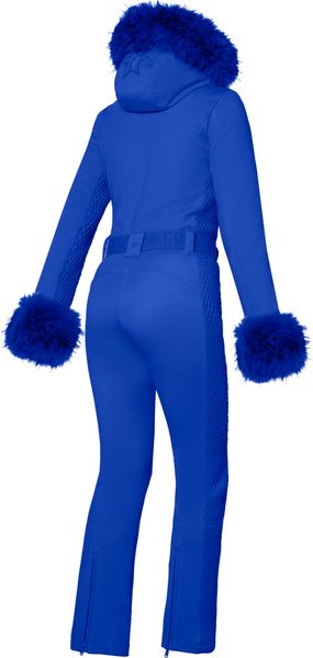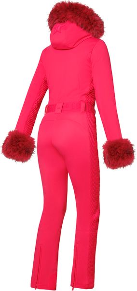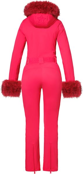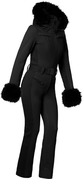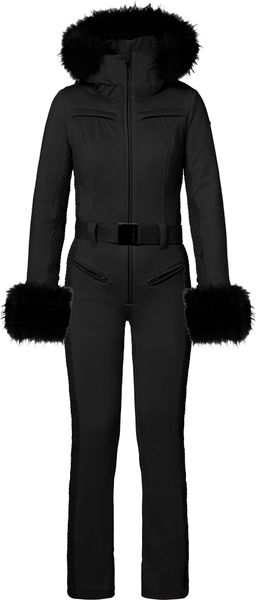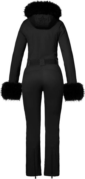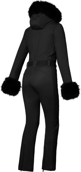 "The smock details along the side seam and arms and the decorative faux leather star appliqué on the fixed hood are particularly eye-catching. The faux fur hem and cuffs give the suit a luxurious touch. For those who prefer a simpler look, the model is also available without a faux fur trim. The Angele ski suit has a slim fit and is ideal for fashion-conscious female skiers who value style and function"