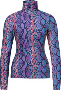 "The Fiesta Ski Pully from Goldbergh is the ideal companion for every ski trip. With its powerstretchinterlock material and softly padded back, it not only offers excellent freedom of movement, but is also comfortable to wear in cold temperatures. The close-fitting collar and longer front zip provide additional protection and comfort, while the striking, full-length star pattern adds a fashionable accent."