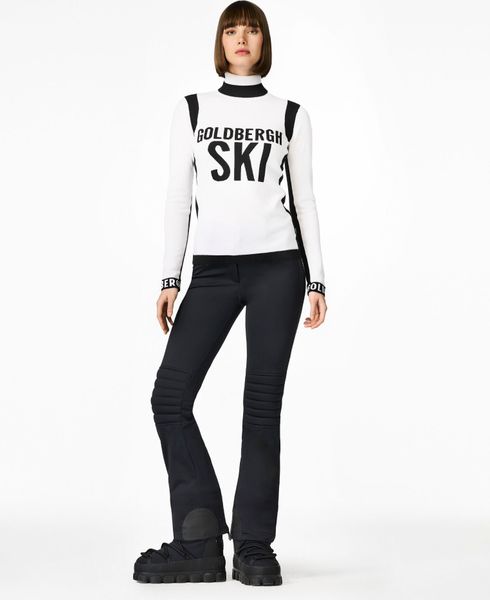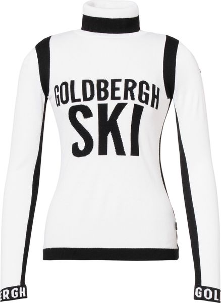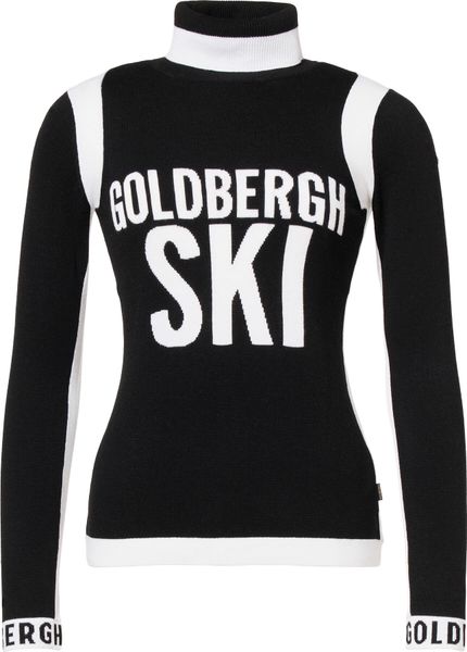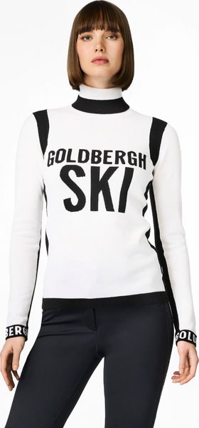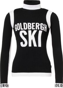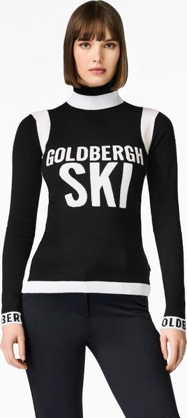 "The Noemi Long Sleeve Knit Sweater by Goldbergh is the perfect companion for stylish female skiers who also want to cut a good figure off the slopes. The sweater stands out with its close-fitting turn-down collar and the striking multicolored "l'amour du ski" design, which is artfully knitted on the chest". The contrasting goldbergh knitted details on the cuffs and the elegant metal brand label on the sleeve give the sweater a luxurious touch."