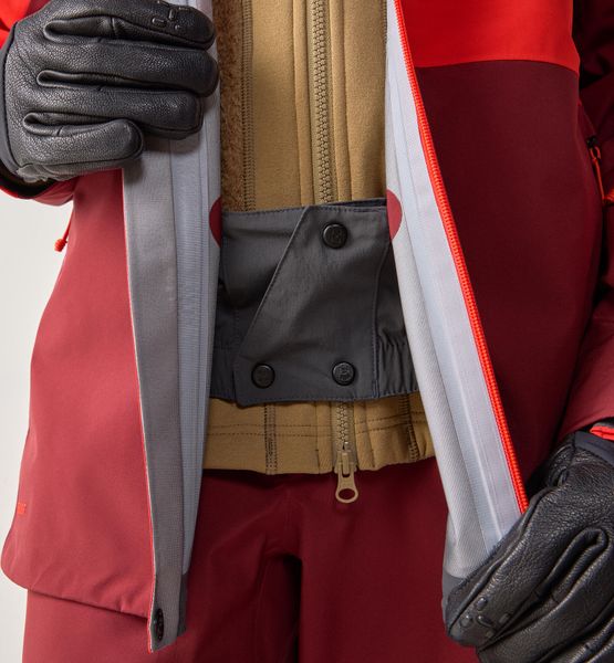 "The jacket is equipped with several practical pockets: two slit pockets with zippers, two breast pockets and a special ski pass pocket on the sleeve. The drawstring-adjustable hem and the pre-shaped sleeves with adjustable Velcro fastening at the cuffs ensure a perfect fit and additional comfort on all your adventures."
