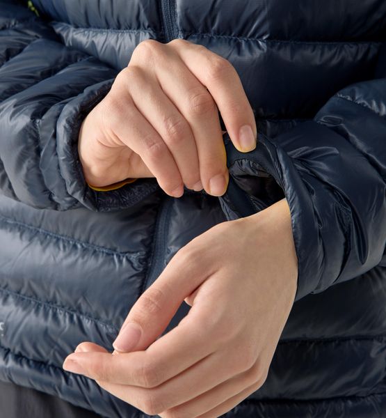 "The jacket impresses with its body-hugging baffle construction, which specifically ensures optimum insulation and breathability. Practical features such as the close-fitting hood, which fits easily under any helmet, as well as the adjustable hem and elasticated cuffs with soft edging offer additional protection and comfort. Two slit pockets with zippers offer space for important items, while reflective elements increase visibility in low light conditions."