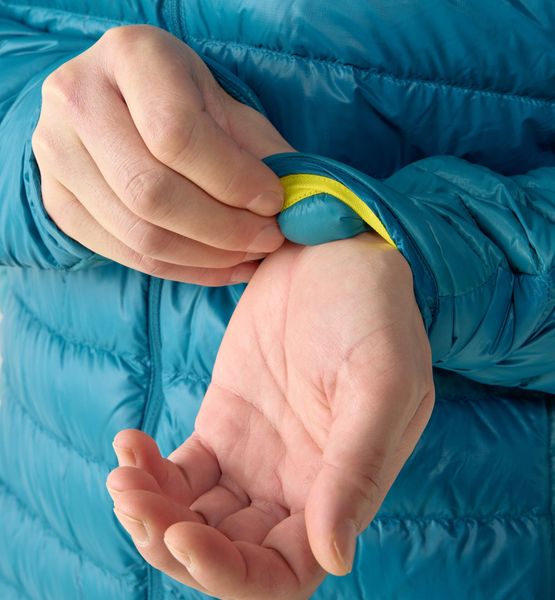 "The body-hugging baffle construction supports thermal performance exactly where it is needed most, while the high stand-up collar offers additional protection from the cold. Practical details such as two zipped pockets, an adjustable hem and elasticated cuffs ensure comfort and flexibility with every movement. The long zip at the center front is equipped with an insulated zip placket to minimize heat loss."