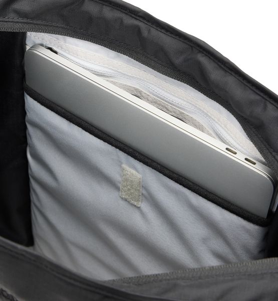 "With a volume of 25 liters, the TIGHT TOTE 25 offers enough space for all important utensils. The main compartment is equipped with a padded laptop compartment so that electronic devices can also be safely stowed awayu00f6nnen. Open side pockets and a front pocket with zipper closure offer additional storage space for smaller items. The bag can be carried in three different ways: by hand, over the shoulder or as a backpack. The stowable shoulder straps and side compression straps allow for easy adjustment and maximum comfort"