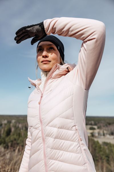 "The Huippu W Down Hybrid Jacket from Halti is the perfect choice for those looking for a more active alternative to the classic down jacket. This jacket combines premium RDS-certified duck down with an impressive fill power of 700, which provides exceptional warmth without sacrificing lightness. The Pertex Quantum Ripstop fabric not only gives the jacket durability, but also a protective layer against wind and weather. The stretch sleeves and side inserts are specially designed to ensure maximum freedom of movement, making it ideal for activities such as approach and via ferrata."
