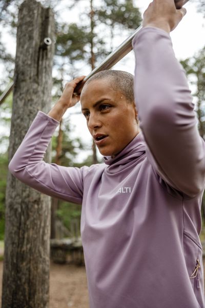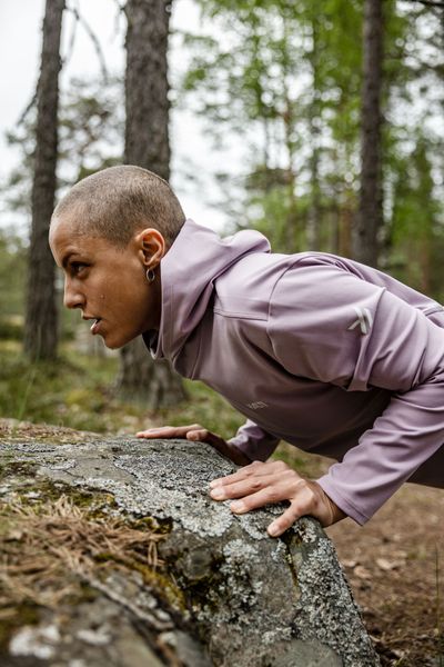 "The zippered pocket on the back is particularly practical and is perfect for small items. The inner stand-up collar and the well-fitting hood, which also has an opening for a ponytail, guarantee additional comfort and functionality during training. Reflective details ensure increased visibility in the dark, which improves safety when running or exercising outdoors. The decorative stitching on the back, inspired by the shapes of fjälls in Lapland, gives the hoodie a unique and stylish look"