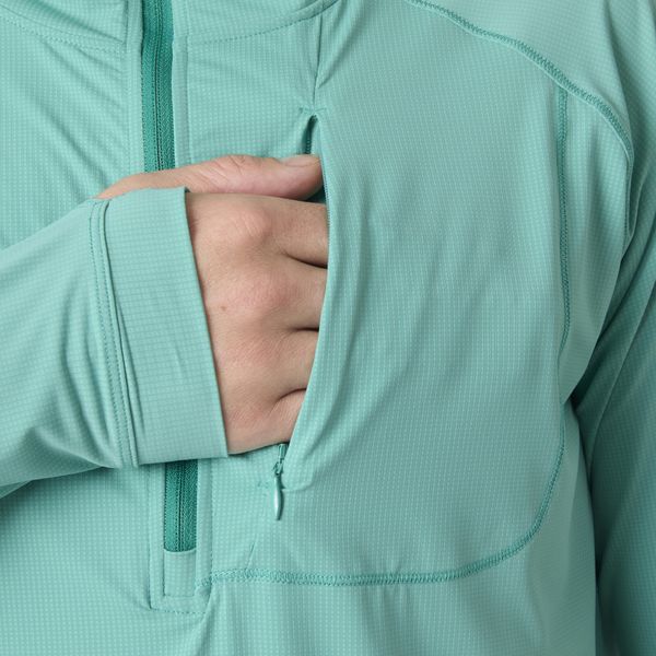 "Made from an innovative material mix of 80% recycled polyamide and 20% elastane, the hoodie combines sustainability with flexibility. The wool ensures a comfortable warmth, while the UV protection factor UPF 50 effectively protects your skin from the sun's harmful rays. The close-fitting hood, practical half zip and thumb holes provide additional comfort and protection from wind and weather."
