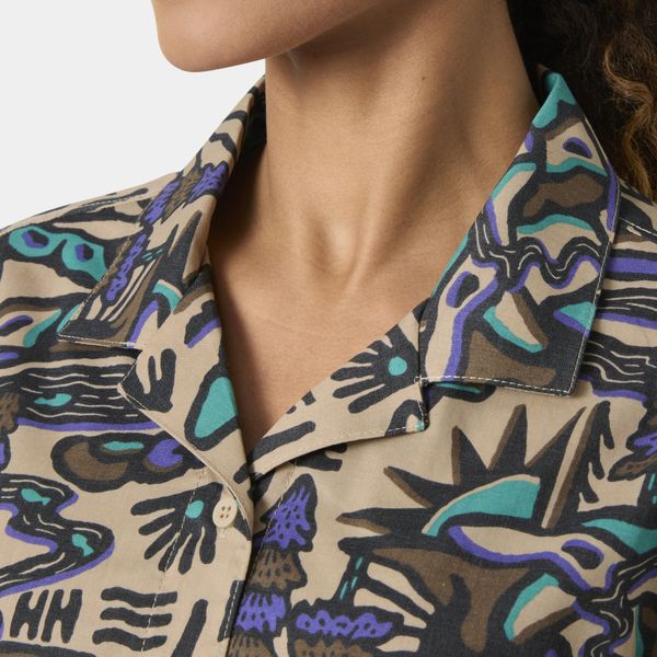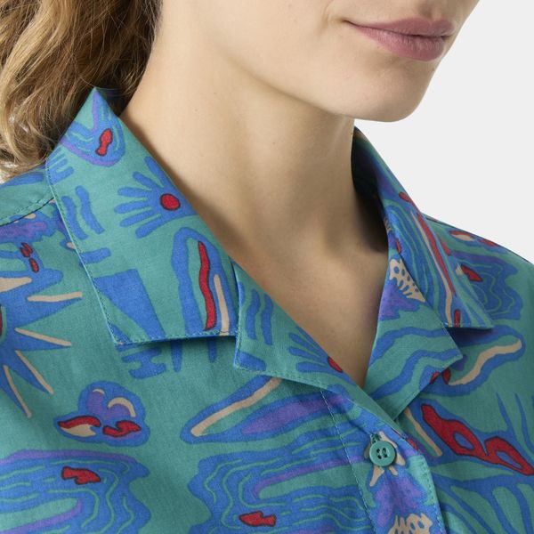 "Lightweight women's shirt for hiking and camping, made from organic cotton and recycled polyester, with a seasonal print."