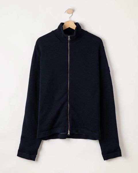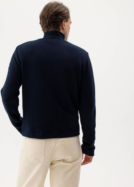 "Windproof wool sweater with two-way zipu00dfastener and high collar, sustainably produced in Europe."