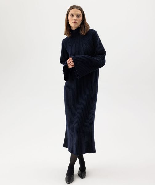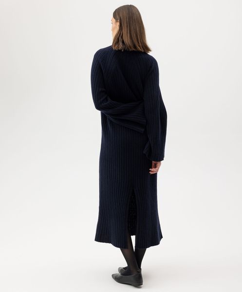 "The AMI dress from Holebrook is a stylish rib-knit dress made from a high-quality wool blend that impresses with its fashionable details. The high collar and wide raglan sleeves not only give the dress a modern look, but also make it comfortable to wear. The relaxed fit and calf-length cut make it ideal for everyday wear. A sophisticated slit at the back also underlines the fashionable design."