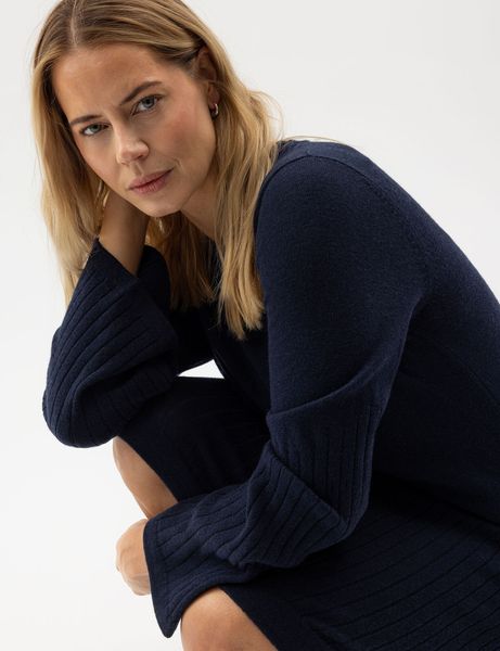 "Elegant knitted dress made from merino wool with textured details and the Woolmark label, sustainably produced in Europe."