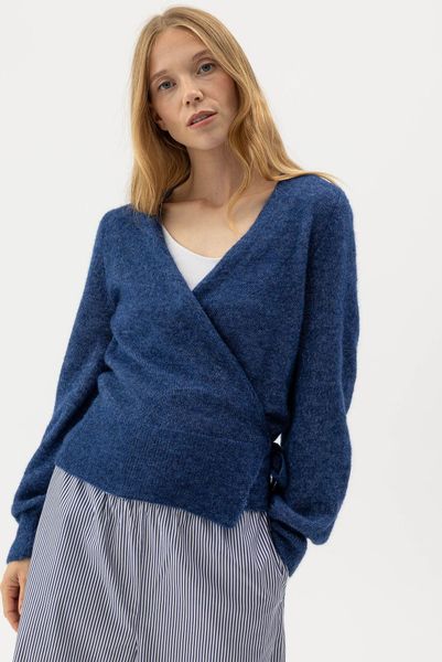 "Elegant women's cardigan in a wrap style with a tie belt, made from a soft alpaca blend and sustainably produced in Europe."