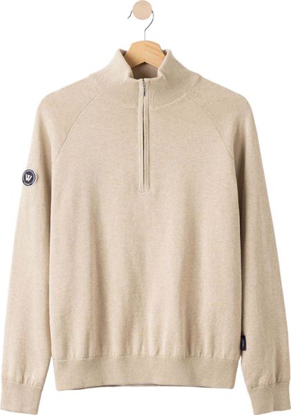 "Windproof knitted sweater with a high collar and zipper, ideal for golf and light outdoor activities."