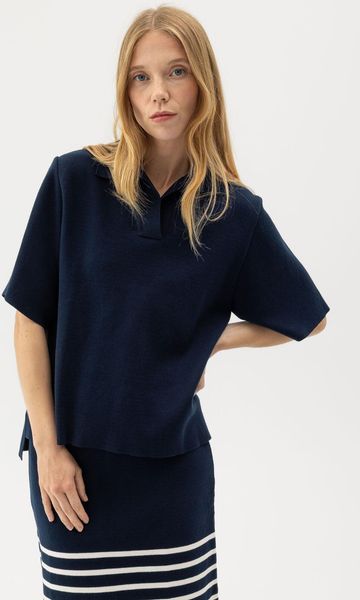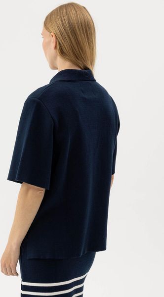 "Elegant women's polo made of wool with a relaxed fit and V-neck, sustainably produced in Europe."