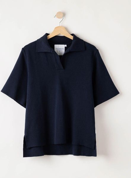 "Discover the Lissie TOP by Holebrook u2013 a stylish and versatile garment that will add an elegant touch to your wardrobeu2013. This 100% wool polo shirt offers a high-quality texture and a comfortable feel thanks to the Milan knit. The relaxed, boxy fit with wide sleeves ensures a casual look that is still chic and modern. The Vneckline with collar gives the design a classic touch and makes it ideal for a wide range of occasions."