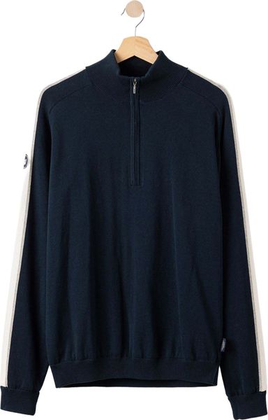 "Discover the stylish and functional sweater that is perfect for outdoor activities like golf. The windproof Ludvig T-neck WP from Holebrook is made from 100% high-quality organic cotton and offers a sustainable choice for environmentally conscious buyers. The sweater impresses with its sporty, block-colored details and a regular fit, which is underlined by raglan sleeves and a high collar with zip fastening."
