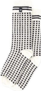 "Timeless knitted socks in a wool blend with a subtle pattern and ribbed top in three stylish colors."