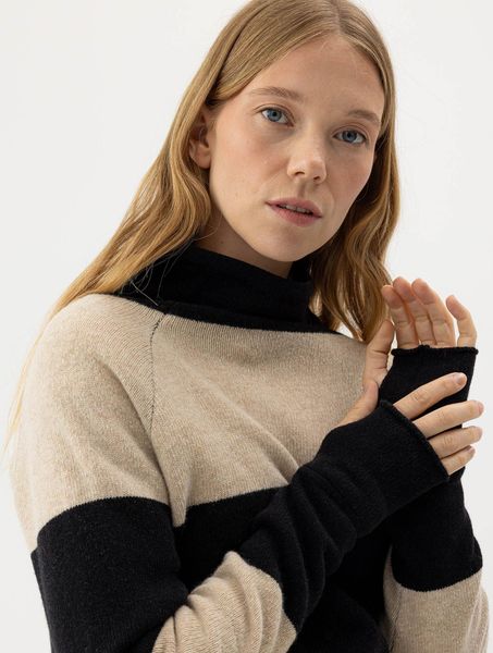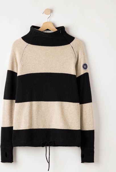 "Windproof wool sweater with thumb holes and drawstring, sustainably produced in Europe."