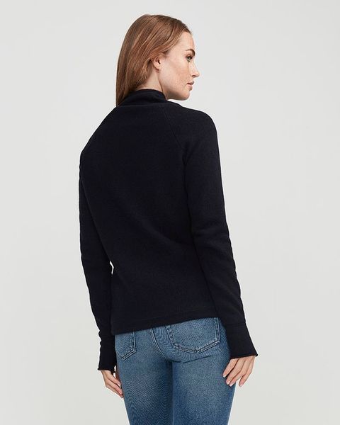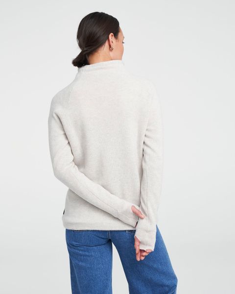 "Windproof wool sweater with a high collar and thumb holes, sustainably produced in Europe."