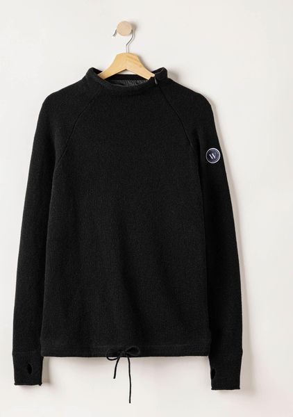 "Windproof wool sweater with thumb holes and drawstring, sustainably produced in Europe."