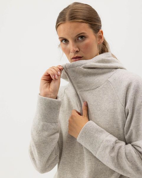 "Windproof women's pullover made from a wool blend with a hood and half zip, sustainably produced in Europe."